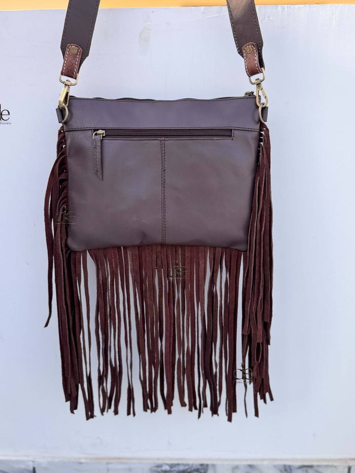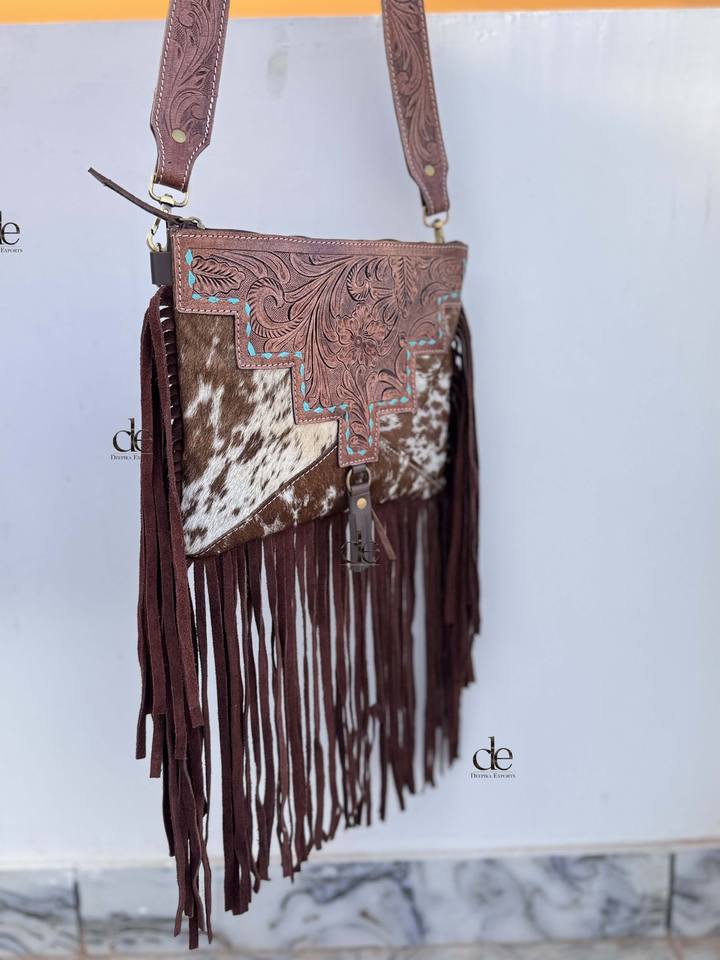 New Unique Designer Hand Tooled Carving Leather Fringe Tote Bag Stylish Purse Cowhide Fur Leather Bags for Women's Multi Use