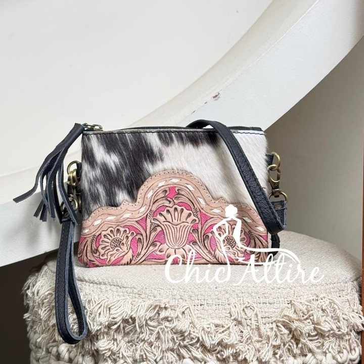 Product name:Hand Tooled Leather Wristlet Crossbody Tassel Pouch