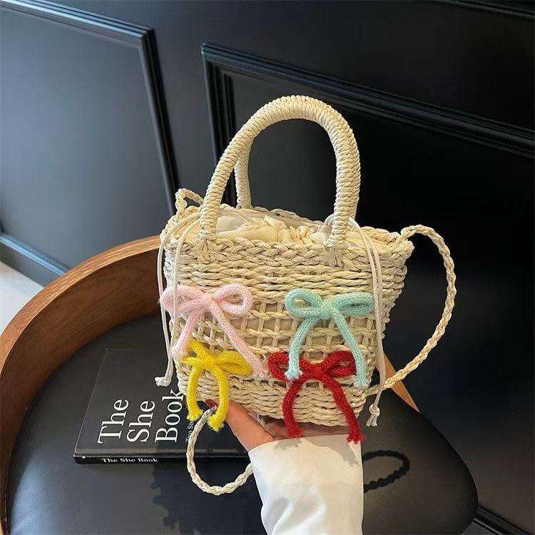 New Vintage Fashion Women's Straw Weaving Bow Handbag with ZIP Closure for Shopping & Travel
