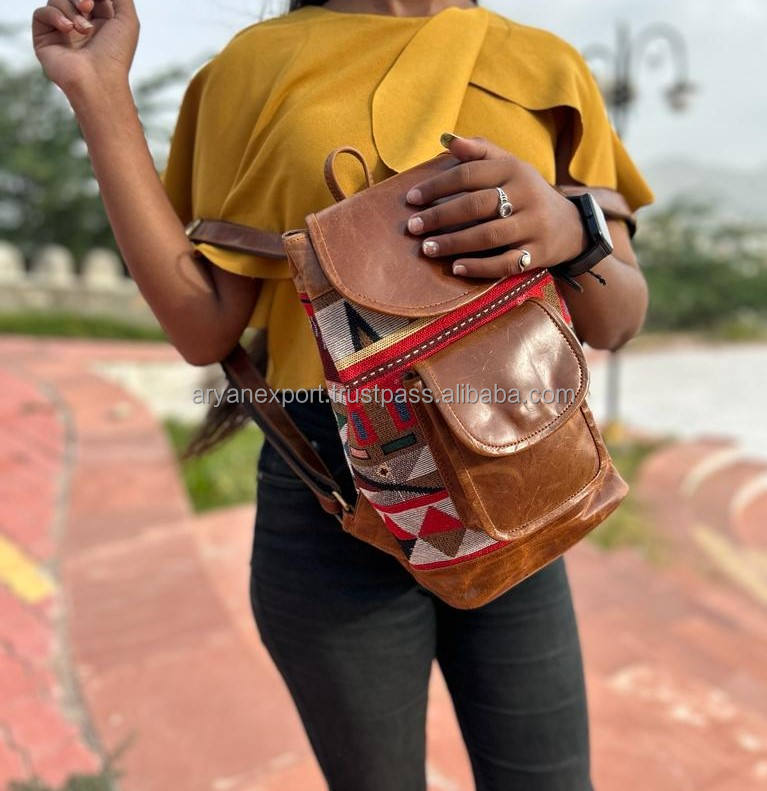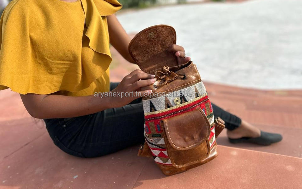 New Western Boho Style Vintage Handmade Jacquard Leather Drawstring Backpacks Hand Stitch Klim Genuine Leather Indian Style Bags
