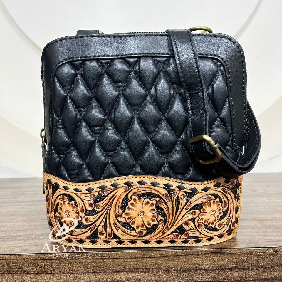 Product Name:Hand Tooled Black Quilted Crossbody Bag
