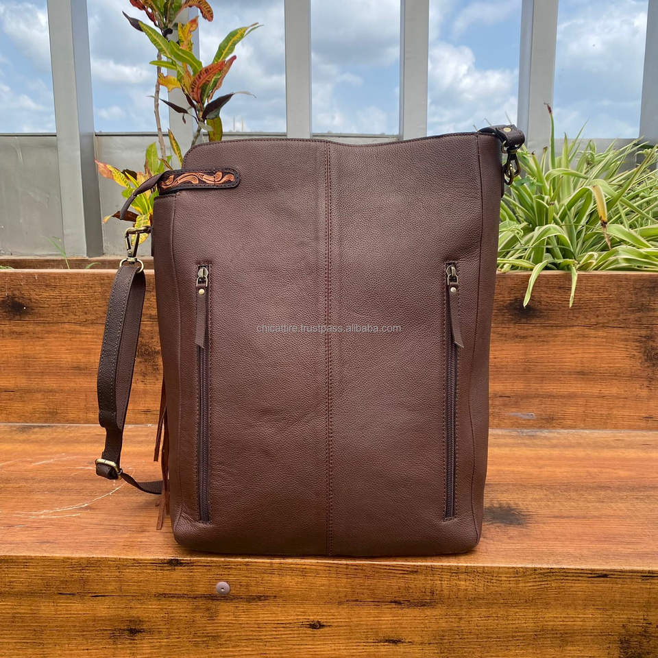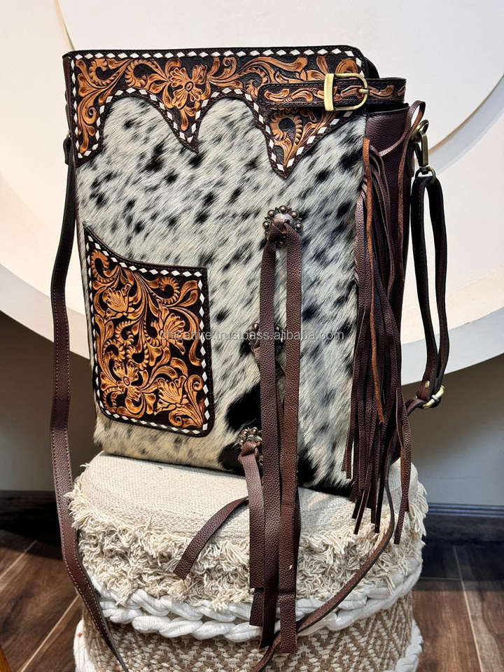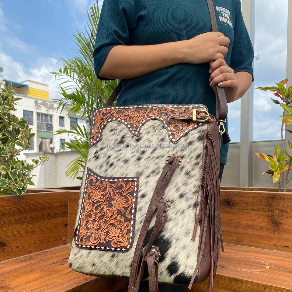 New Western Floral Hand Tooled Leather Cowhide Women Shoulder Purse Hair on Genuine Leather Concealed Carry Concho Messenger Bag
