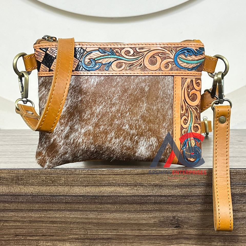 New Western Hand Tooled Cowhide Leather Cross Body Mini Bag with Floral Design Western Style Small Clutch Sling Purse for Women