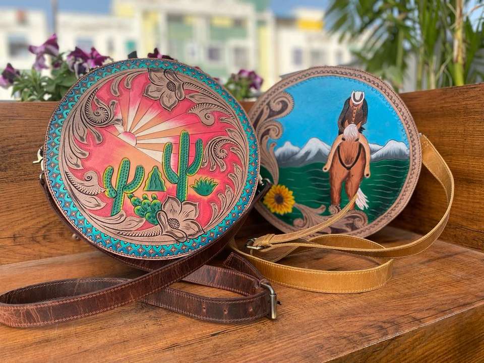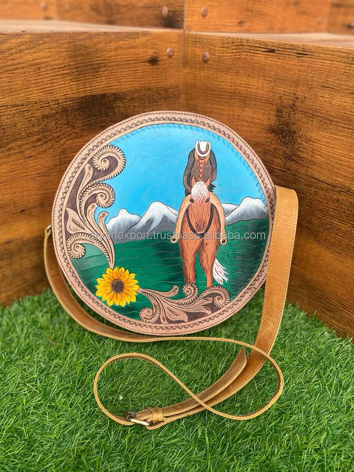 New Western Hand Tooled Leather Canteen Purse Stylish Cowgirl and Sunflower Round Crossbody Bag Genuine Leather Bags for Women's