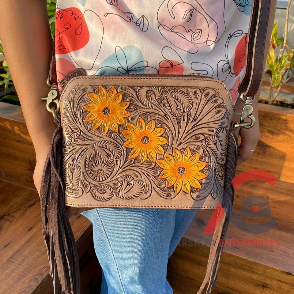 New Western Hand Tooled Leather Sunflower Crossbody Fringe Bag High Quality Handmade Genuine Leather Shoulder Purse for Women's