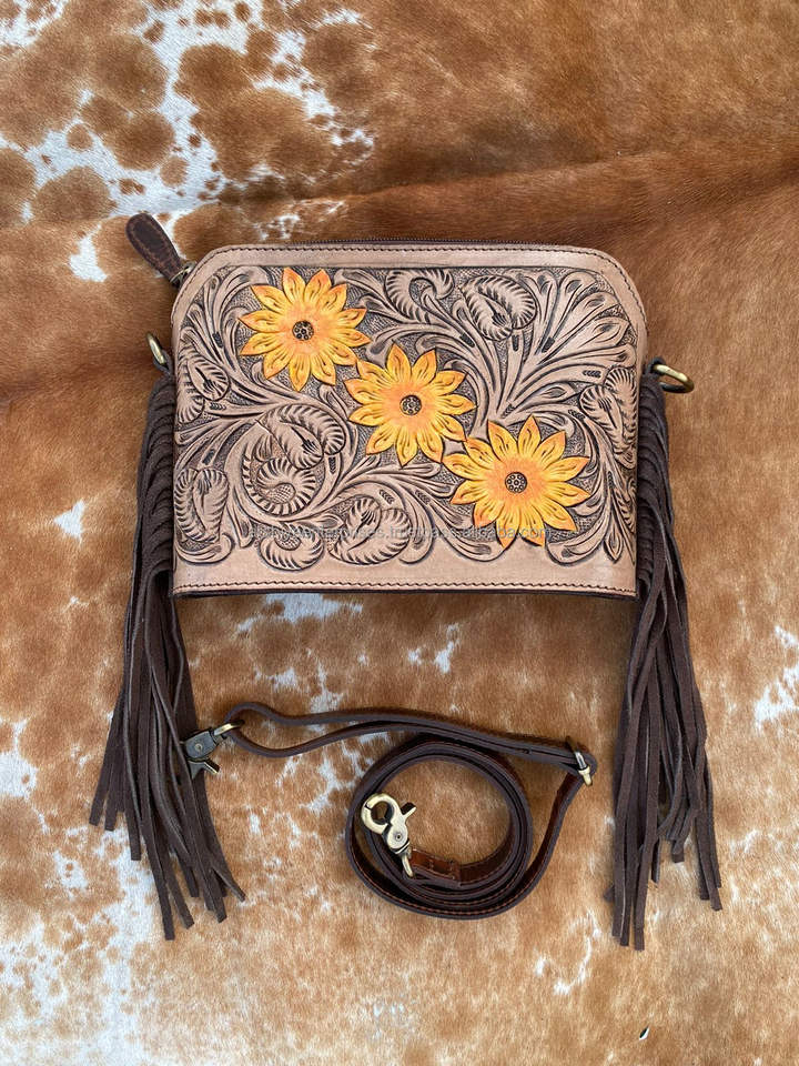 Hand Tooled Leather Sunflower Crossbody Fringe Bag