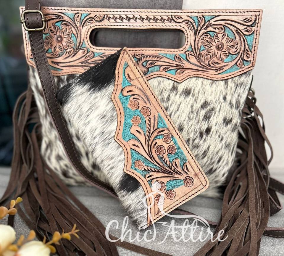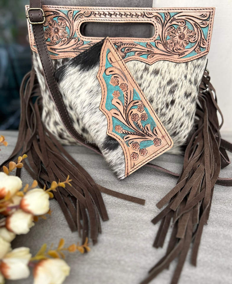 Product name:Hand Tooled Leather Cowhide Fringe Bag & Clucth Combo Set