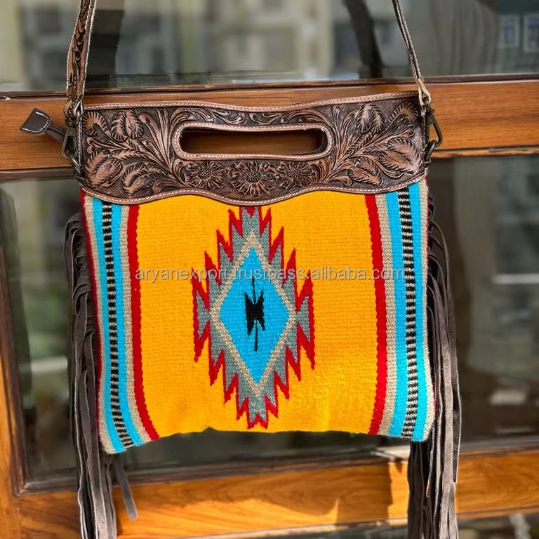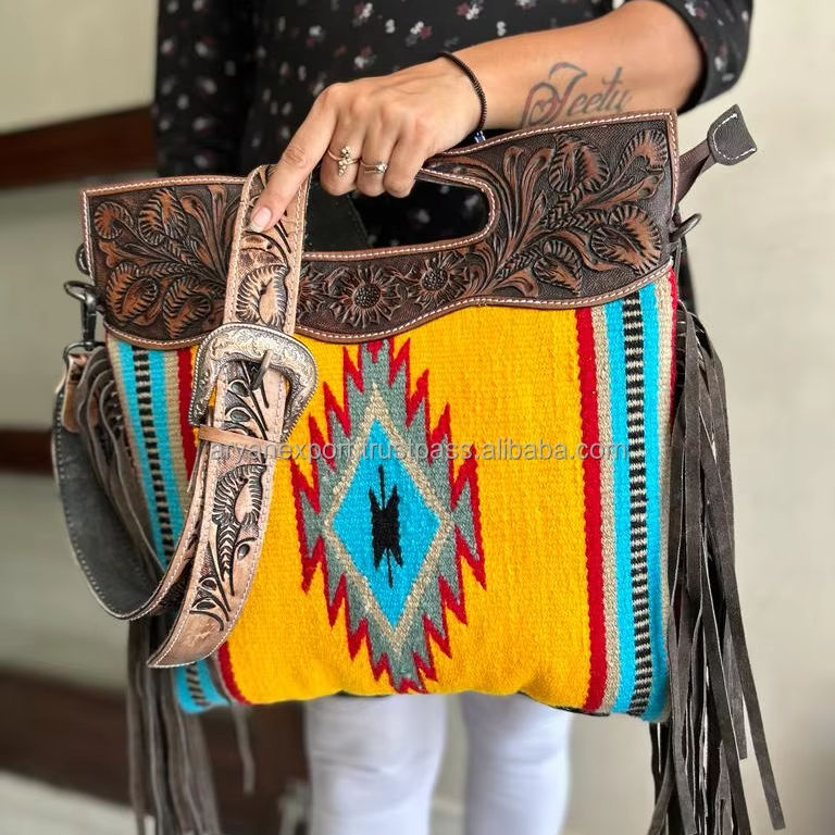 New Western Handcrafted Tooled Jacquard Fabric Fringe Leather Shoulder Bags Premium Quality Genuine Leather Cowgirl Handbags