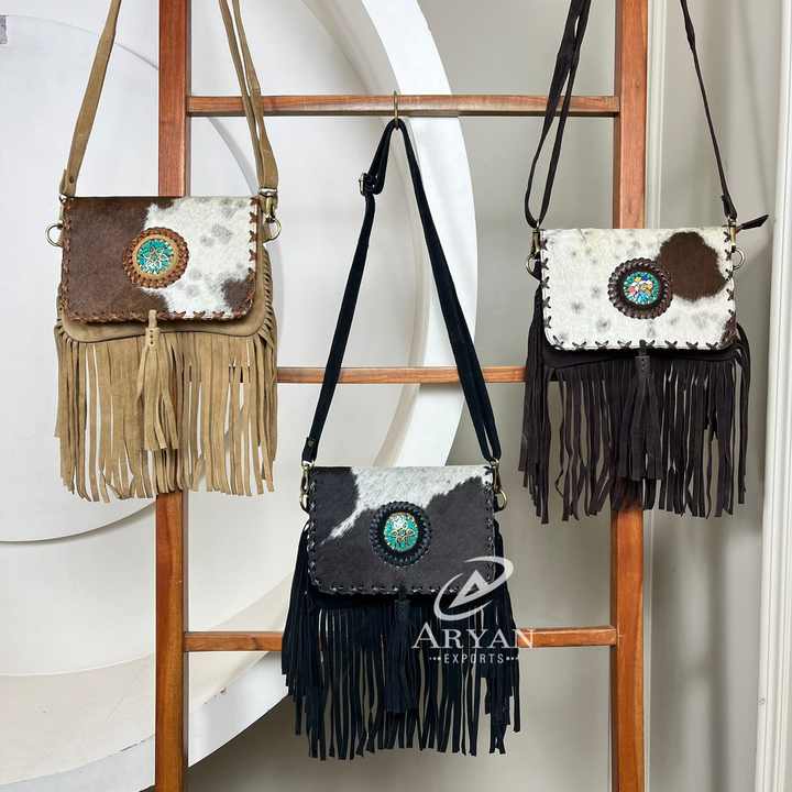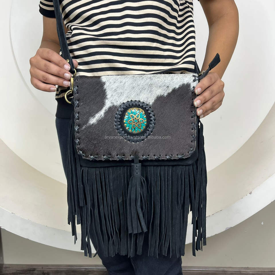 New Western Style Cowhide Fur Leather Fringe Bag High Quality Boho Handbag Womens Genuine Leather Crossbody Shoulder Bag