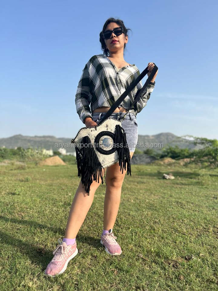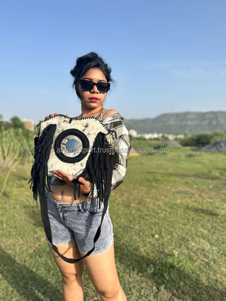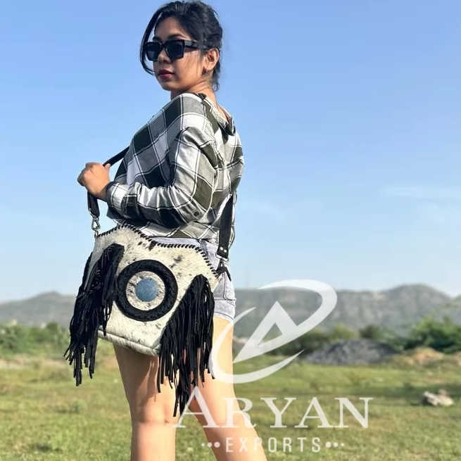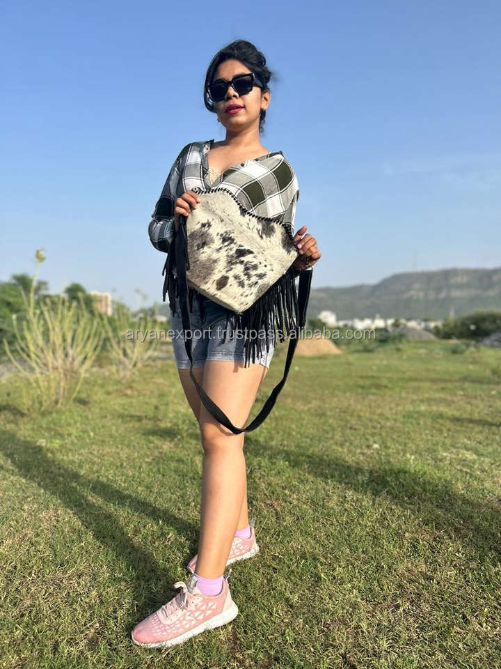 New Western Style Hair on Hide Fur Suede Leather Fringe Bag High Quality Boho Women Fur Leather Unique Middle Concho Fringe Bags