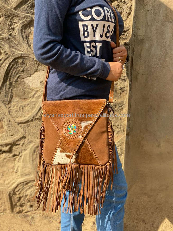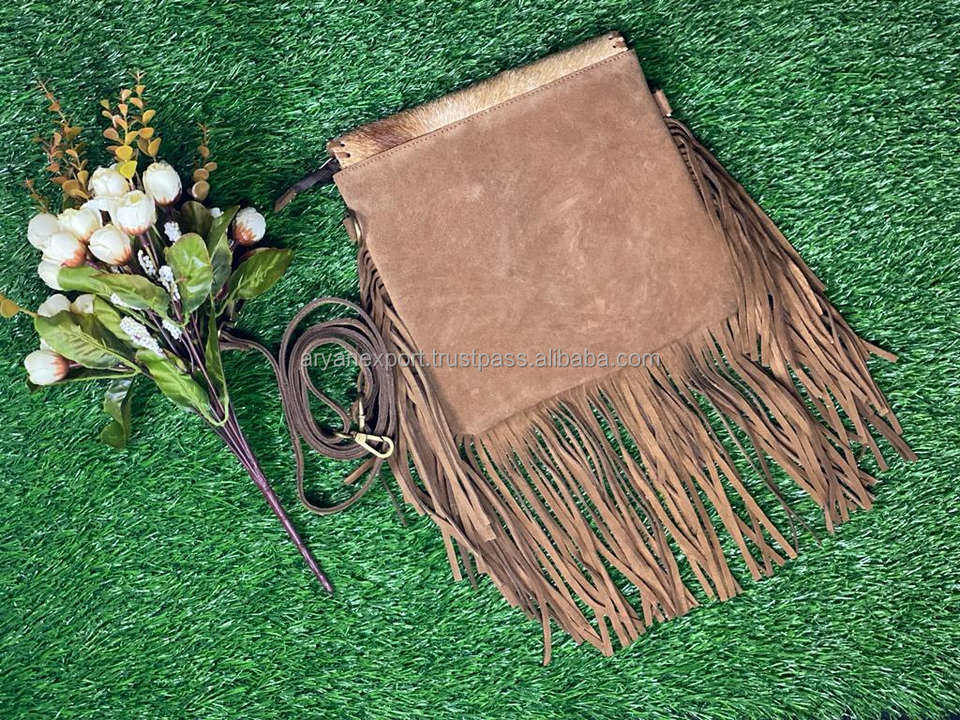 New Western Style Hair on Hide Fur Suede Leather Fringe Bag High Quality Boho Women Fur Leather Unique Middle Concho Fringe Bags