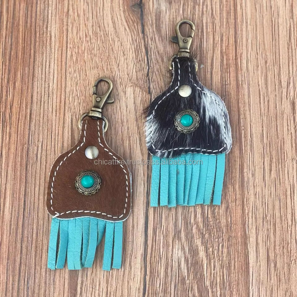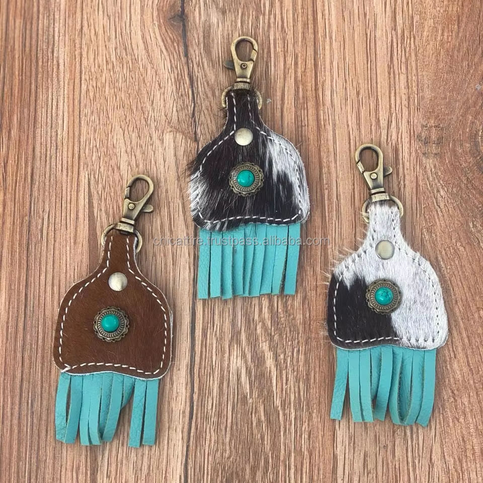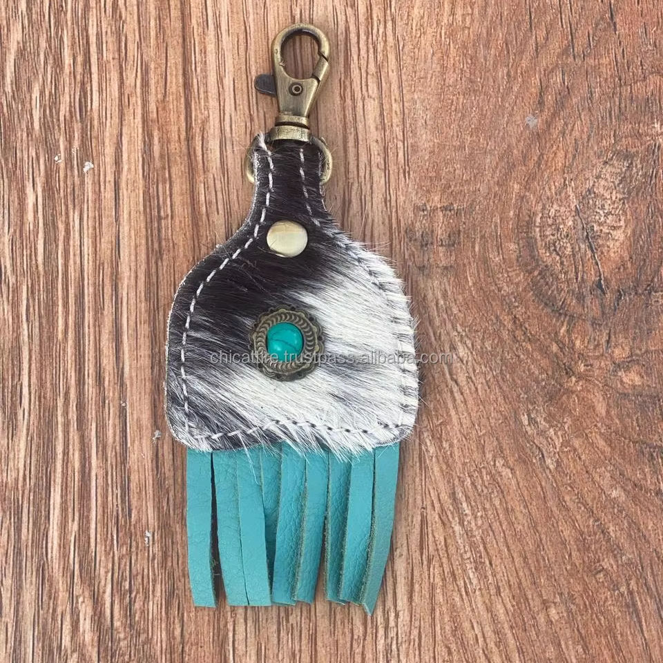 New Western Style Hair on Hide Leather Turquoise Fringe Key Fobs Hot Sale Genuine Leather Unique Shape Keyrings Luxury Keychains