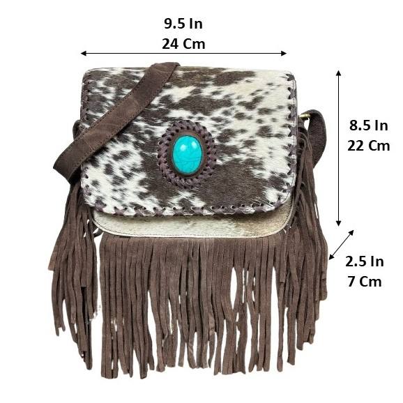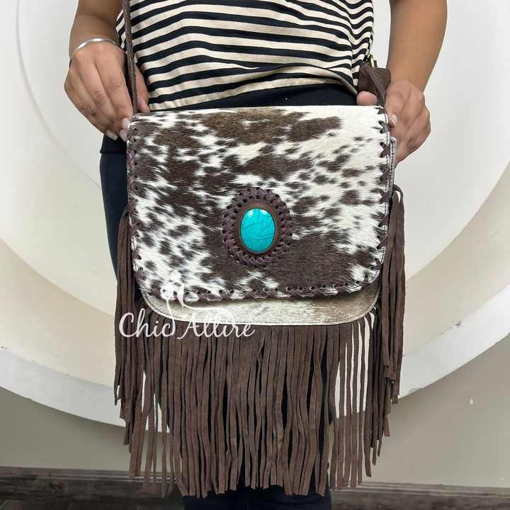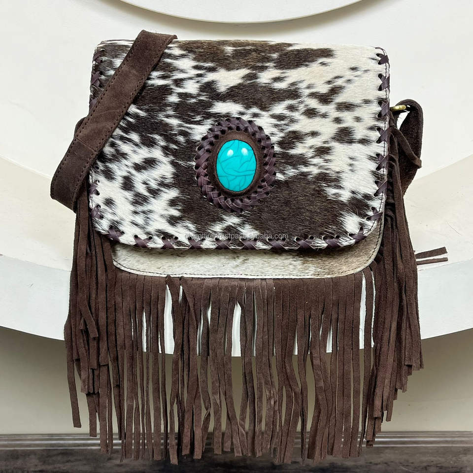 New Western Style Hair on Hide Fur Suede Leather Fringe Bag High Quality Boho Women Leather Shoulder Bag With Turquoise Stone