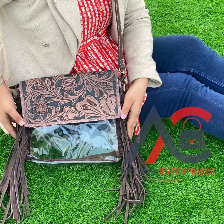 New Western Style Hand Painted Tooled Leather Fringe Clear Stadium Bag Unique Genuine Tooled Leather Concert Clear Crossbody Bag