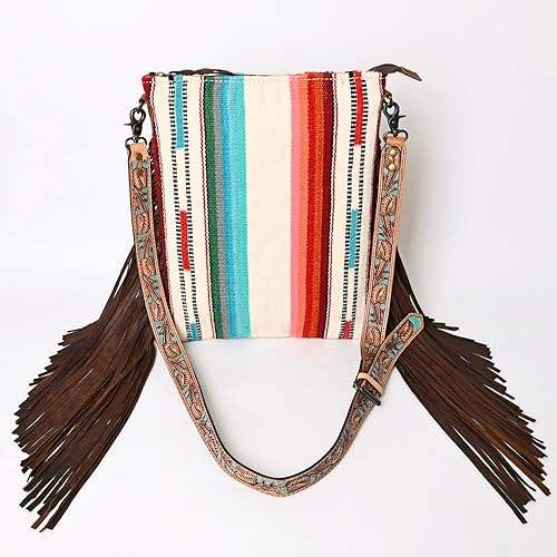 New Western Style Hand Tooled Saddle Blanket Fringe Handbag High Quality Women Aztec Leather Wide Strap Crossbody Bag