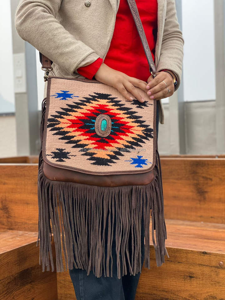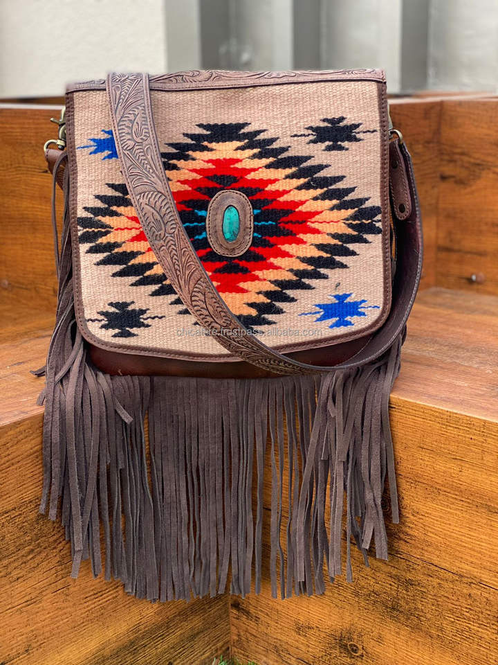 New Western Style Hand Tooled Saddle Blanket Fringe Handbag High Quality Women Aztec Leather Turquoise Stone Crossbody Bags