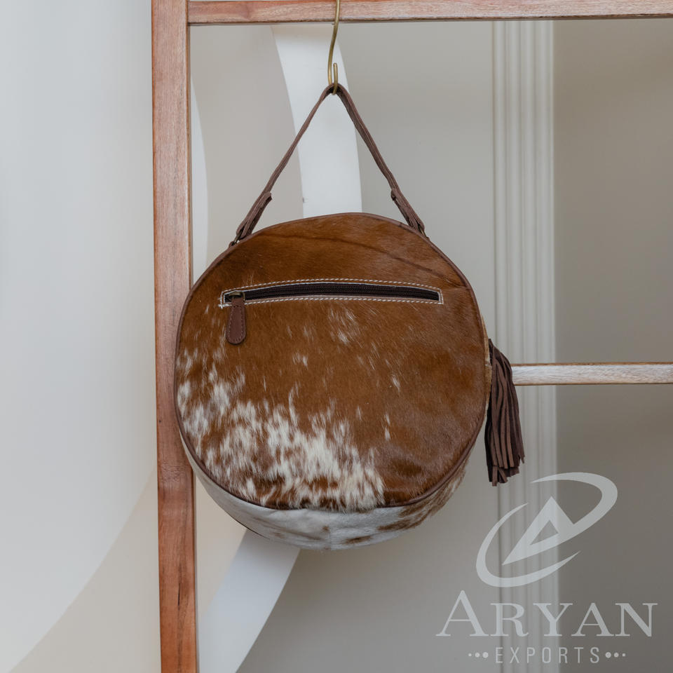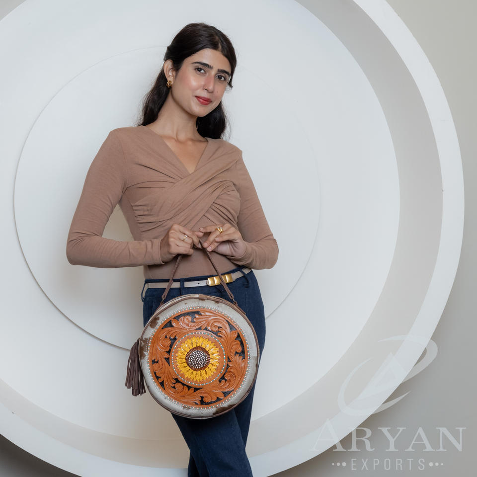 New Western Style Tooled Cowhide Fur Leather Canteen Bag Hand Tooled Round Shape Handbag Women Tooled Leather Shoulder Sling Bag