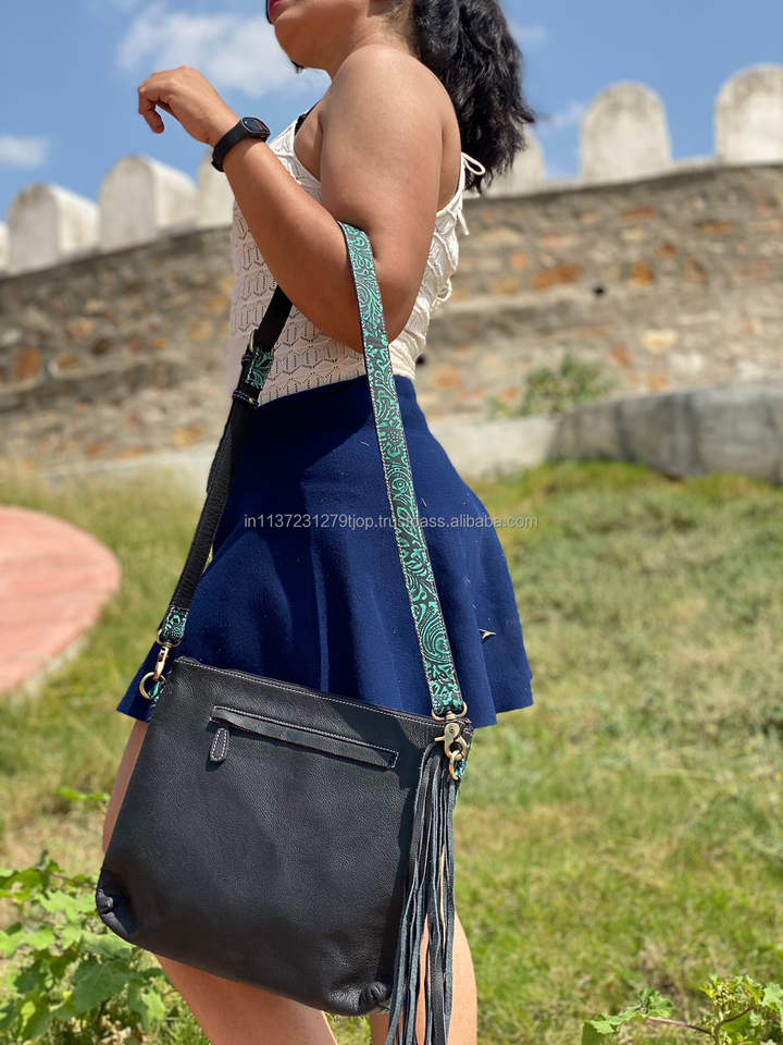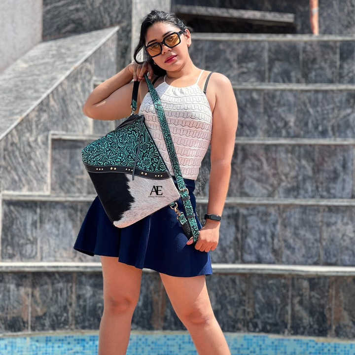 New Western Style Tooled Hair on Hide Fur Leather Sling Bag Women Embossed Color Tooled Fur Leather Vintage Style Side Bag