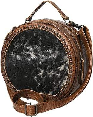 New Western Style Tooled Hair on Hide Fur Leather Canteen Bag Hand Tooled Circular Shape Handbag Women Tooled Leather Sling Bag