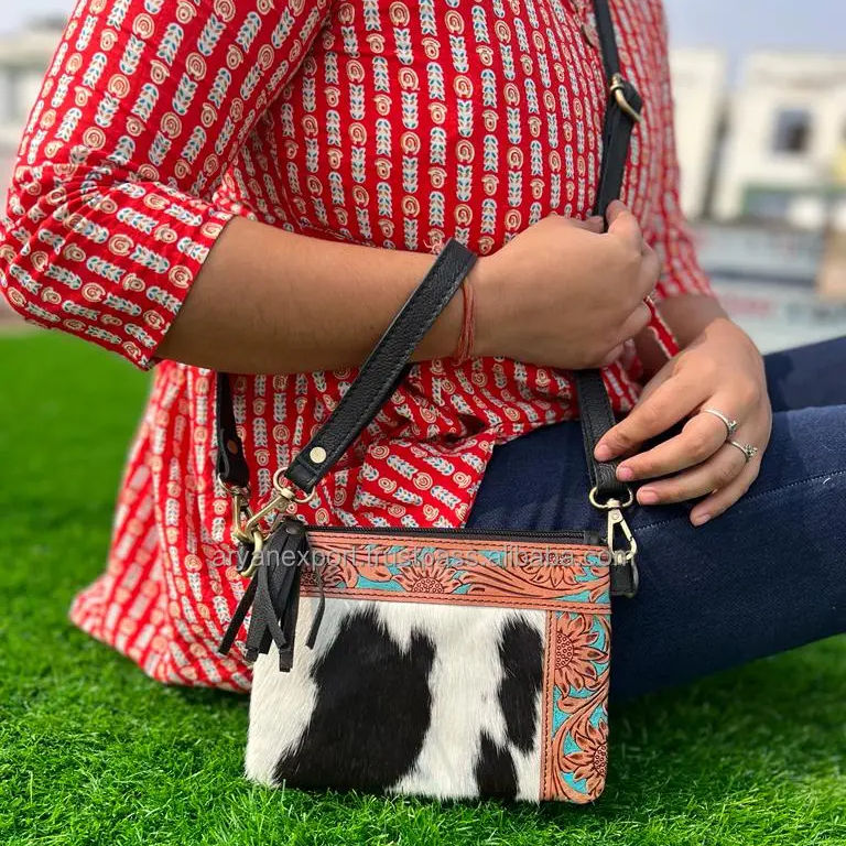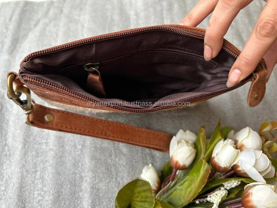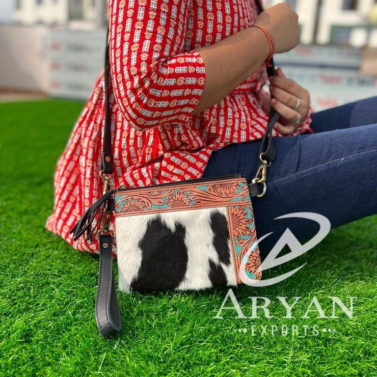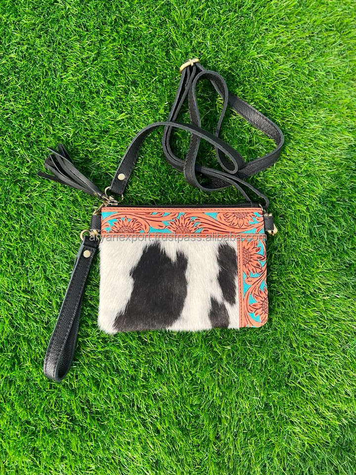 New Western Style Tooled Hair on Hide Fur Leather Sling Bag Women Handcrafted Colour Tooled Leather Wristlet Hand Clutch Purses