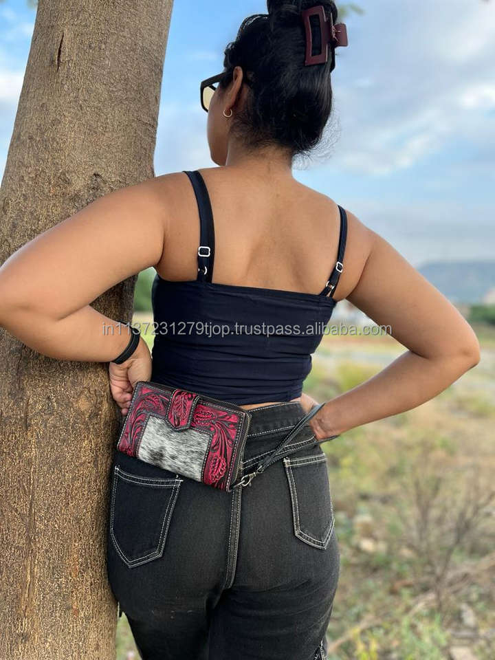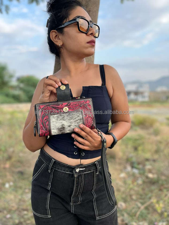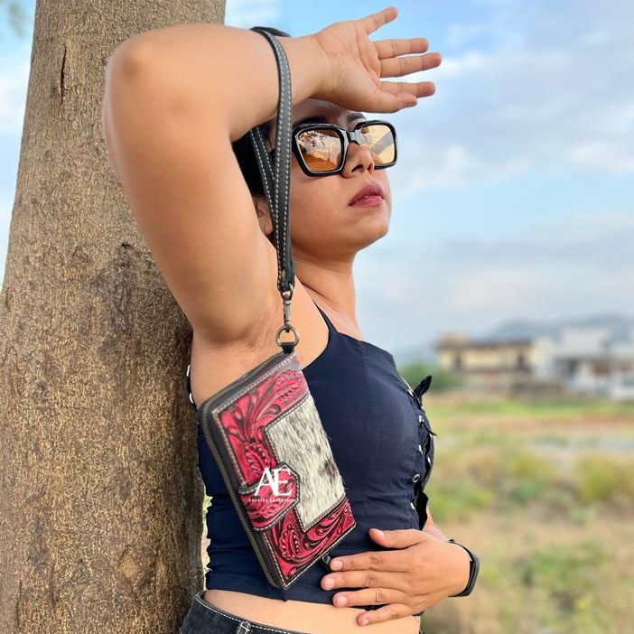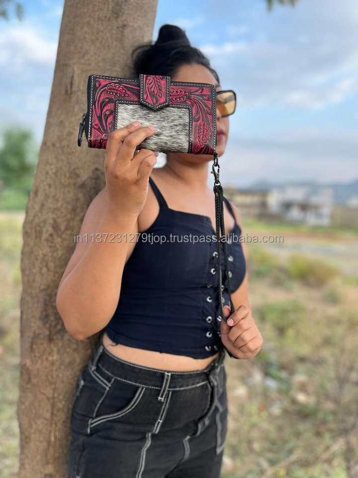 New Western Stylish Cowhide Tooled Fur Leather Wristlets Clutches Women Designed Purse Hot Selling Tooled Leather Unique Wallets