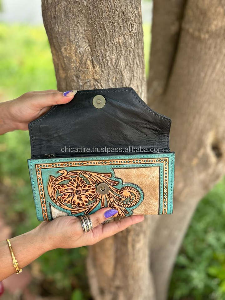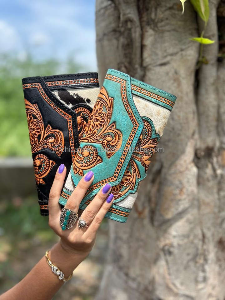 New Western Stylish Hair on Hide Colour Tooled Fur Leather Clutch Women Designed Purse Hot Selling Tooled Leather Unique Wallet