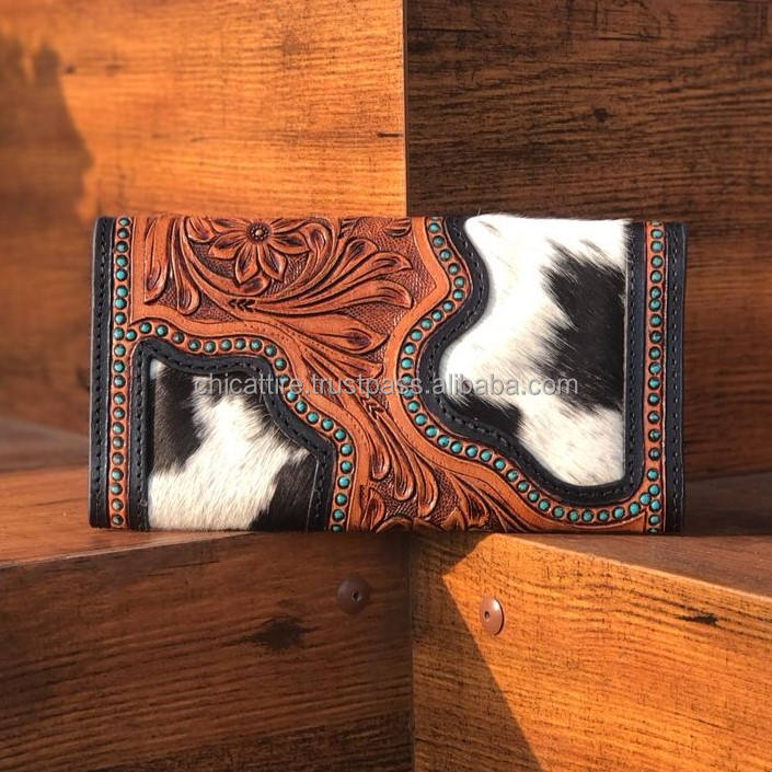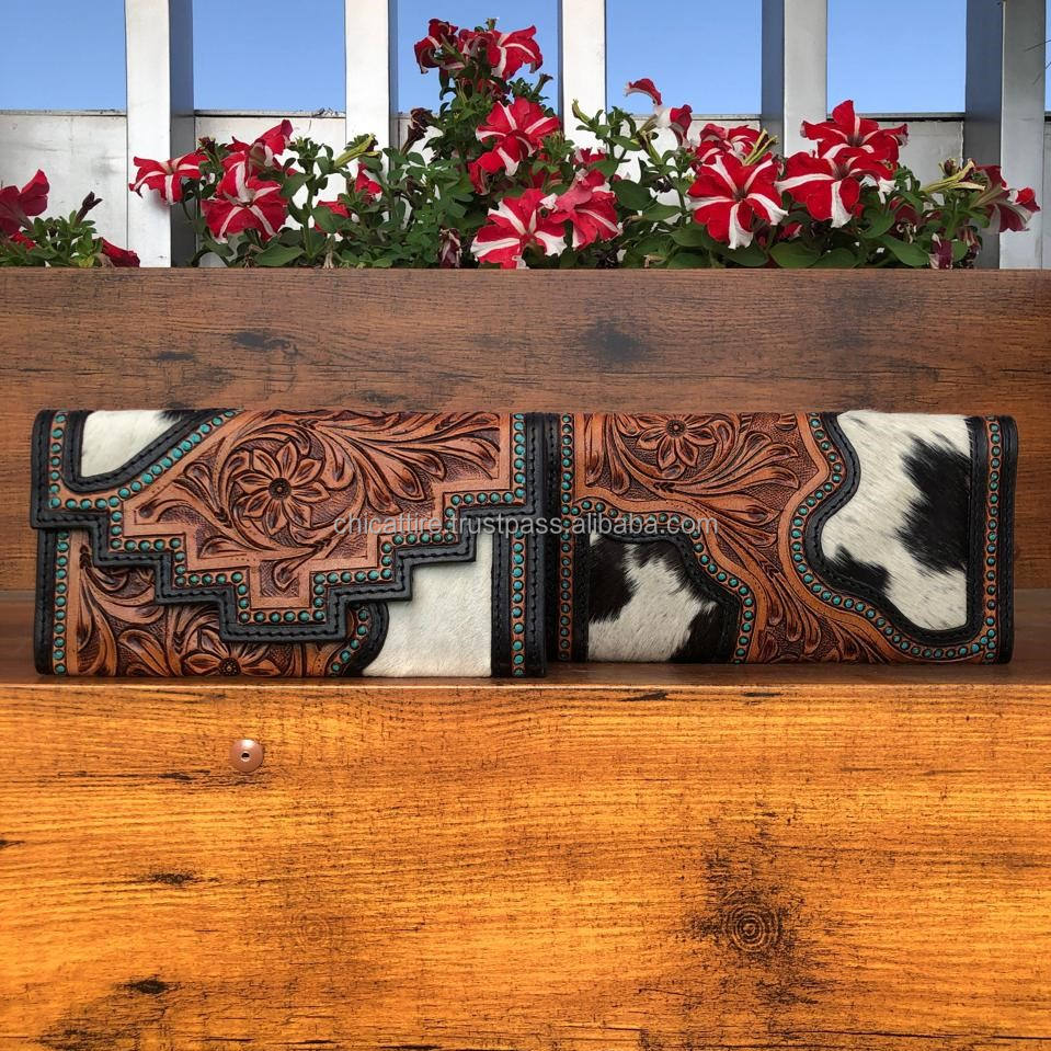 New Western Stylish Hair on Hide Colour Tooled Fur Leather Clutch Women Designed Purse Hot Selling Tooled Leather Unique Wallet