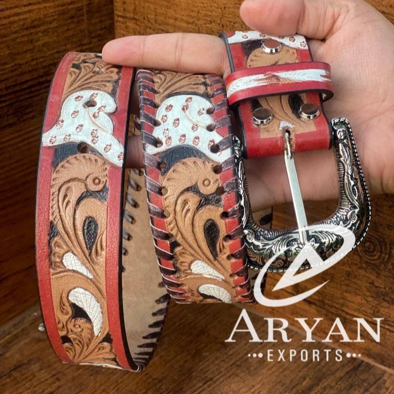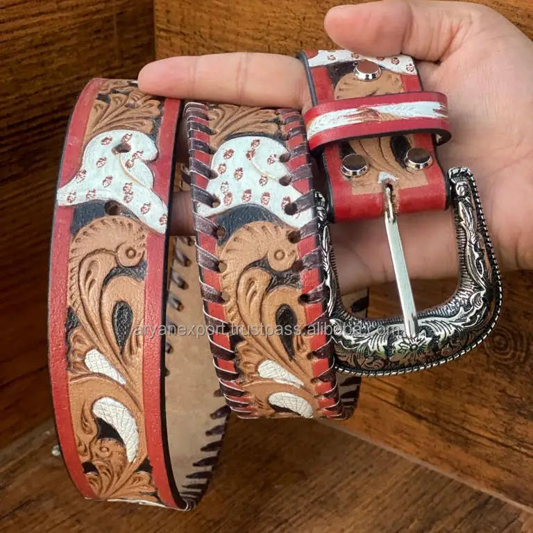 New Western Stylish Real Genuine Hand Tooled Leather Floral Paint Designer Belts High Quality Handmade Leather Unisex Waist Belt