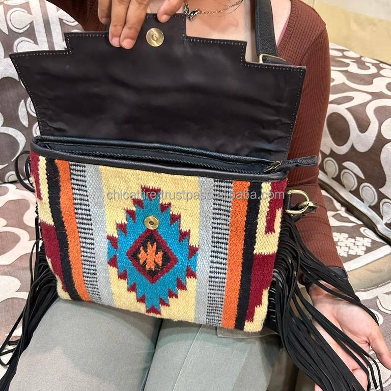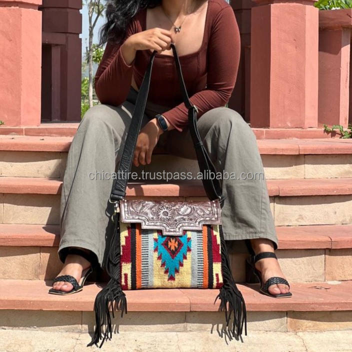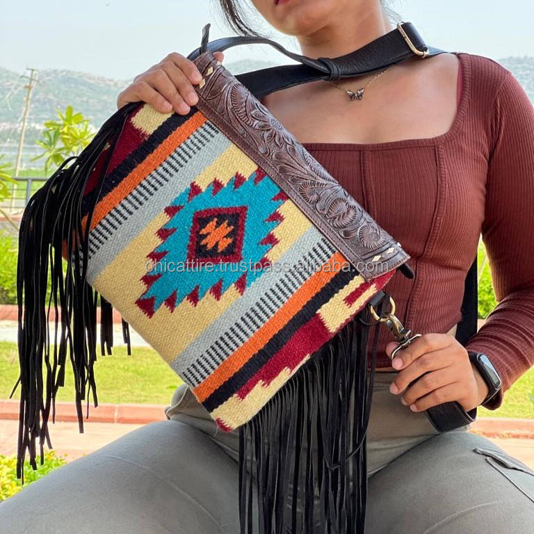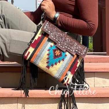 New Western Stylish Saddled Blanket Handbag Tooled Leather Strap High Quality Aztec Side Bags Vintage Colorful Hand Carved Bag
