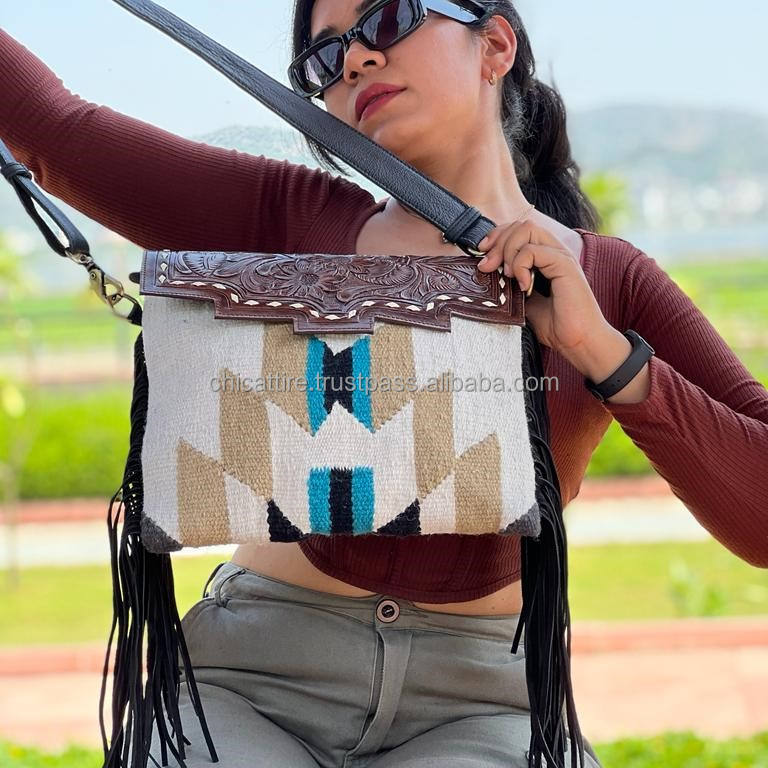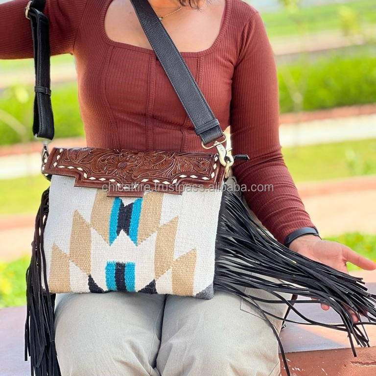 New Western Stylish Saddled Blanket Handbag Tooled Leather Strap High Quality Aztec Side Bags Vintage Colorful Hand Carved Bag