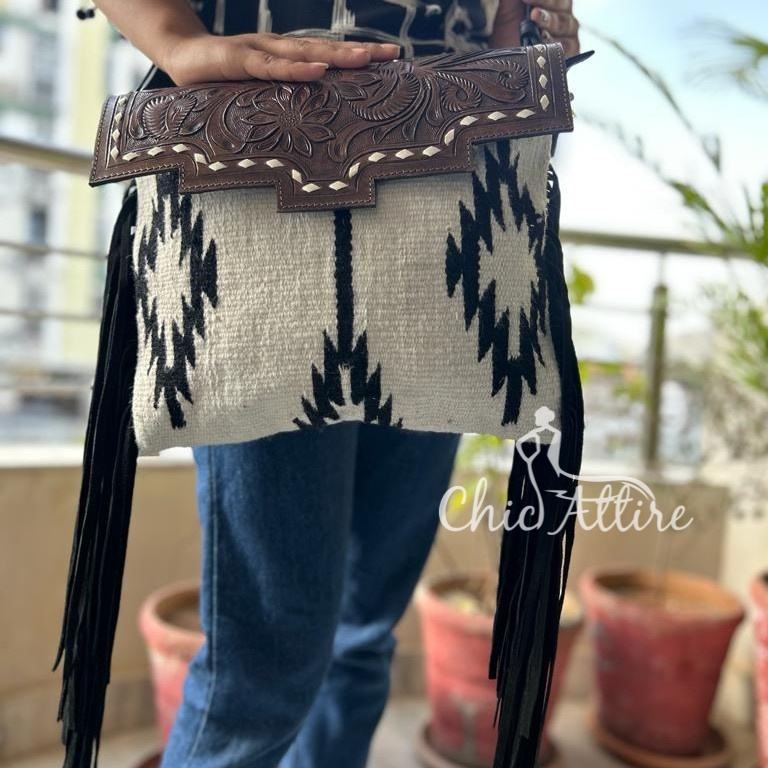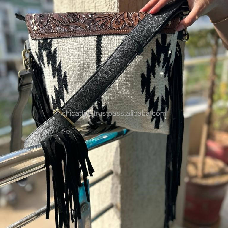 New Western Stylish Saddled Blanket Handbag Tooled Leather Strap High Quality Aztec Side Bags Vintage Colorful Hand Carved Bag