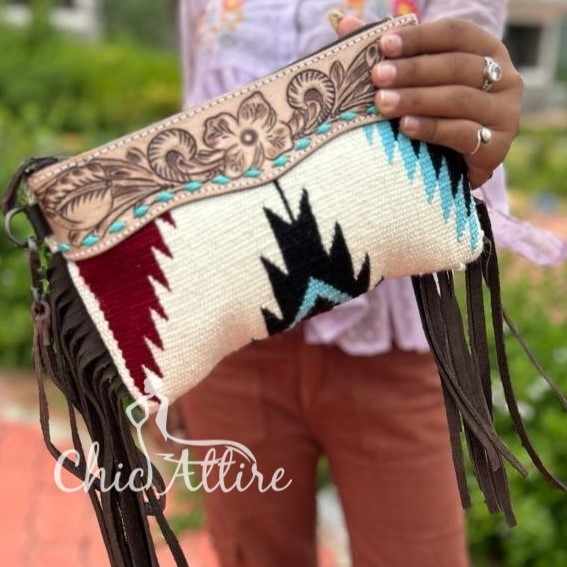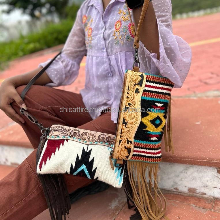 New Western Stylish Saddled Blanket Tooled Leather Sling Bags High Quality Aztec Leather Crossbody Bags Vintage Multi Color Bags