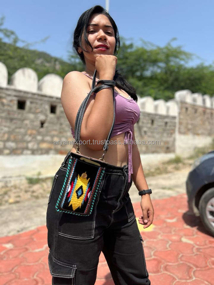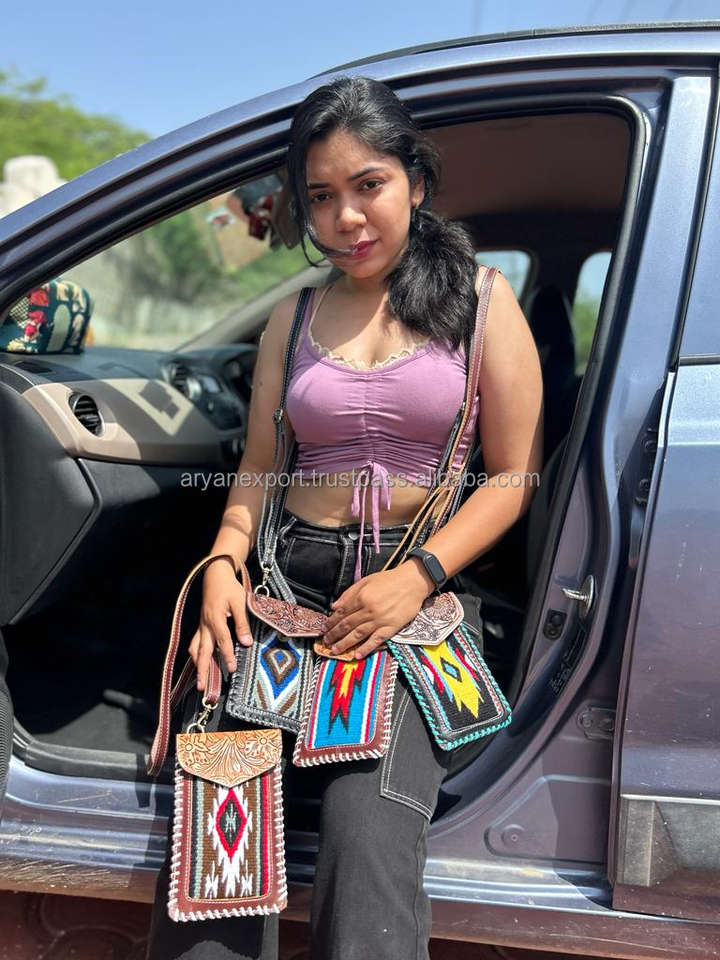 New Western Tooled Jacquard Leather Phone Crossbody Sling Purses Vintage Multi Aztec Fabric Unique Quilted Small Wristlet Purses