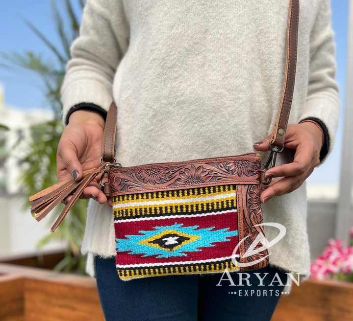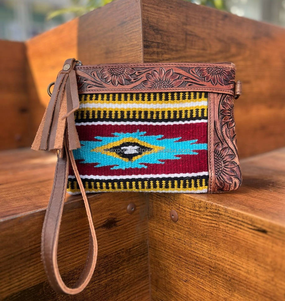 Tooled Leather Saddle Blanket Wristlet Sling Purse