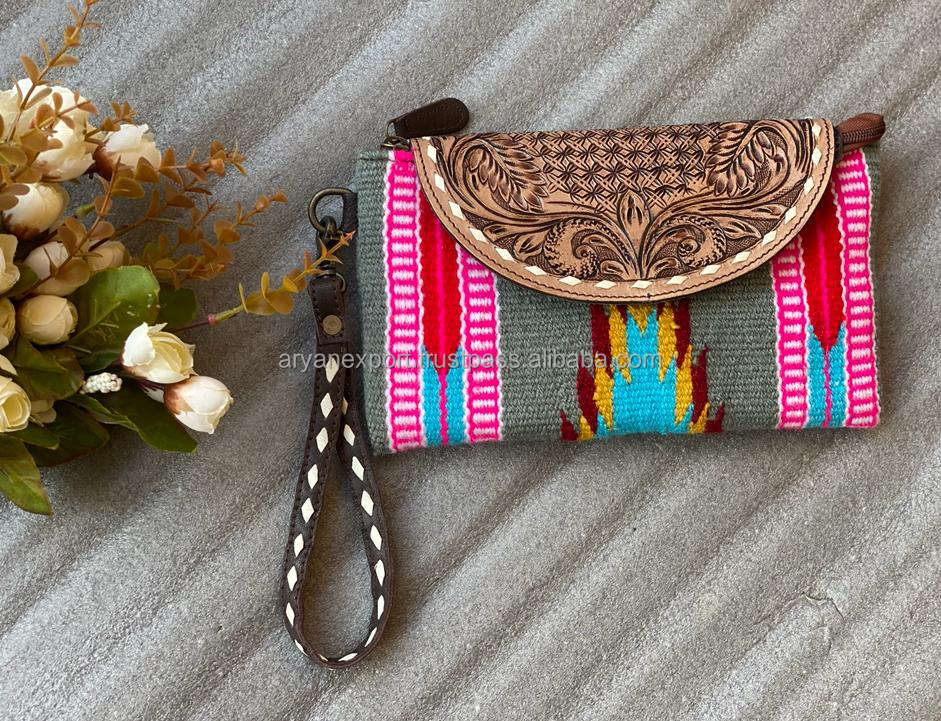New Western Traditional Style Aztec Tooled Leather Handbag Women's Colourful Shoulder Bag and Wristlet Clutch Unique Combo Set