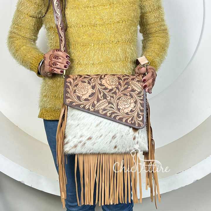 Product name:Hand Tooled Cowhide Leather Fringe Crossbody Bag