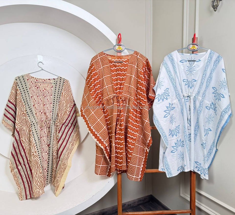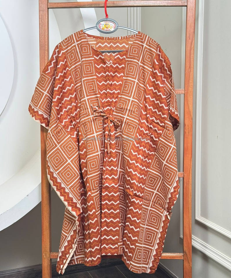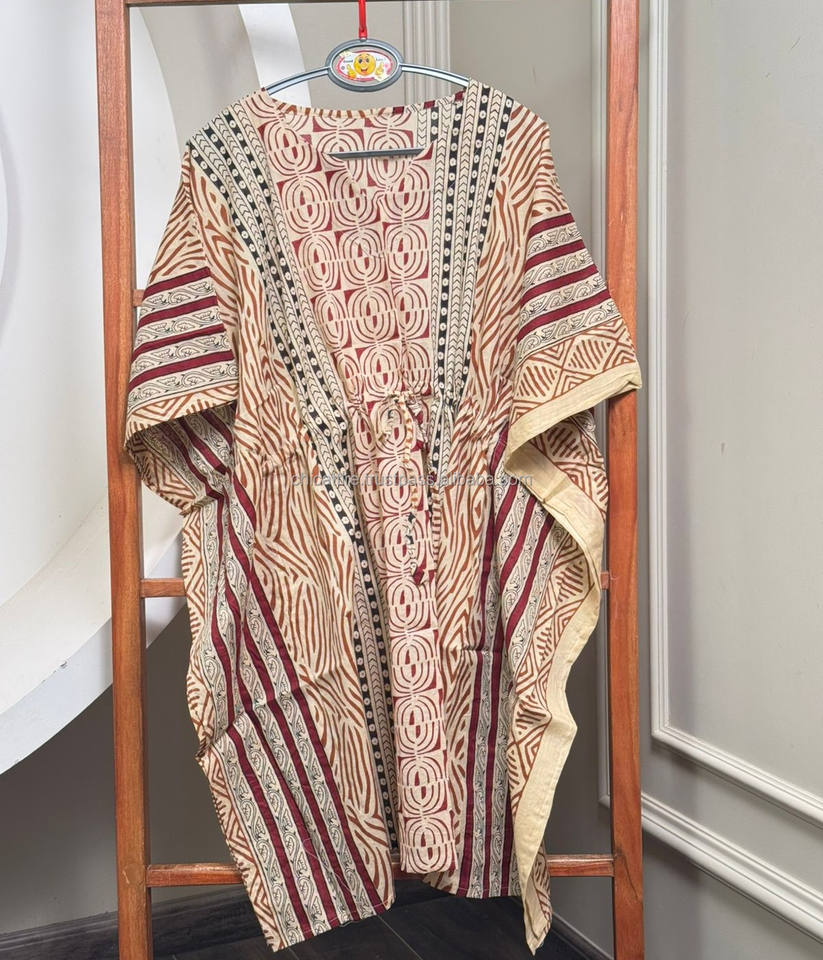 New Wholesale Hand Block Printed One Piece Kaftan Dress with V-Neck & Adjustable Waist Oversized Summer Tunic Dress for Women's