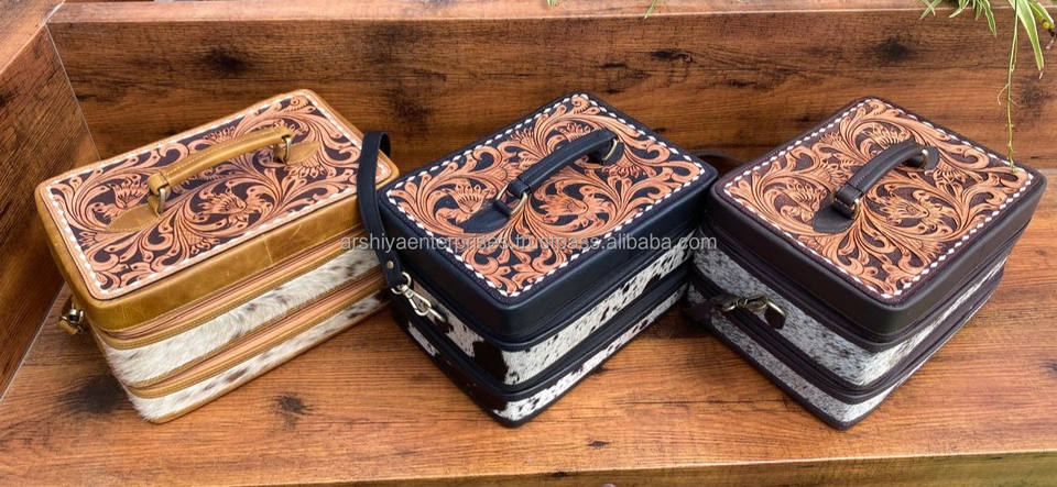 New Wholesale Hand Tooled Cow Leather Double Decker Jewelry Cases for Women Crossbody Strap Travel Jewelry Storage Organizer Box