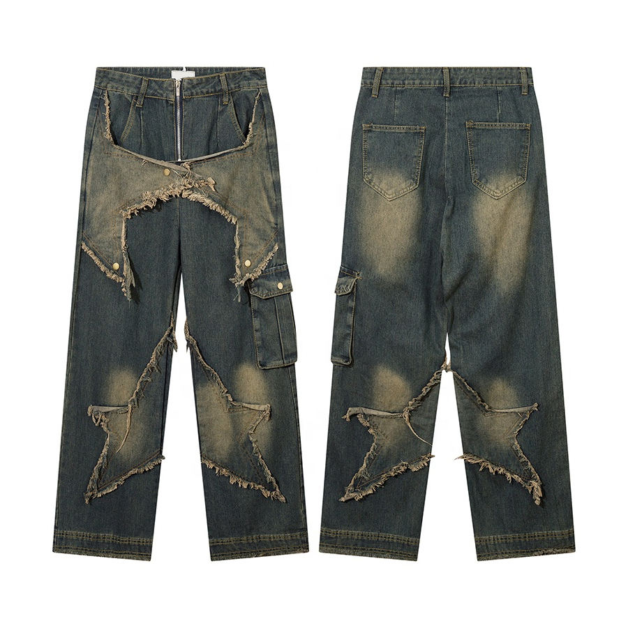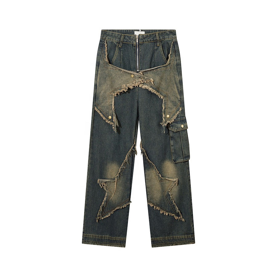 New Wholesale Men's Slim Fit Striped Ripped Denim Jeans High Street Style Breathable Patch Work Design Straight Cut