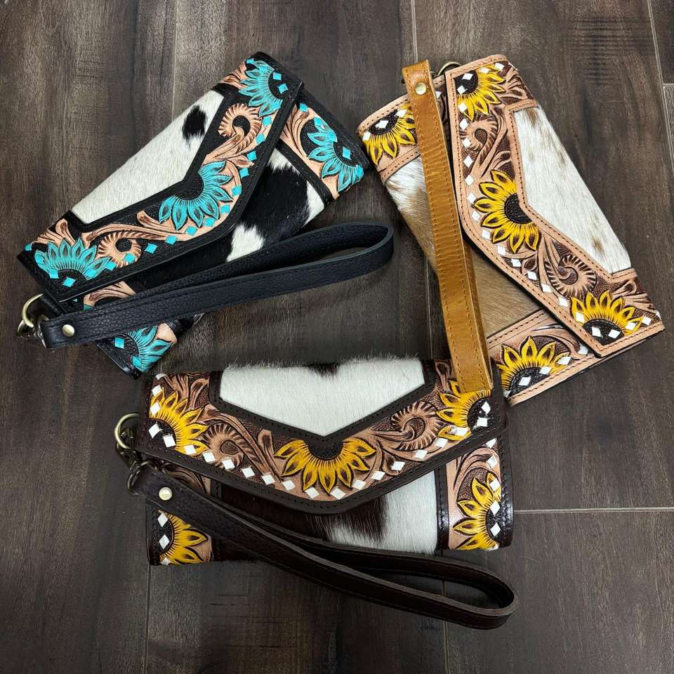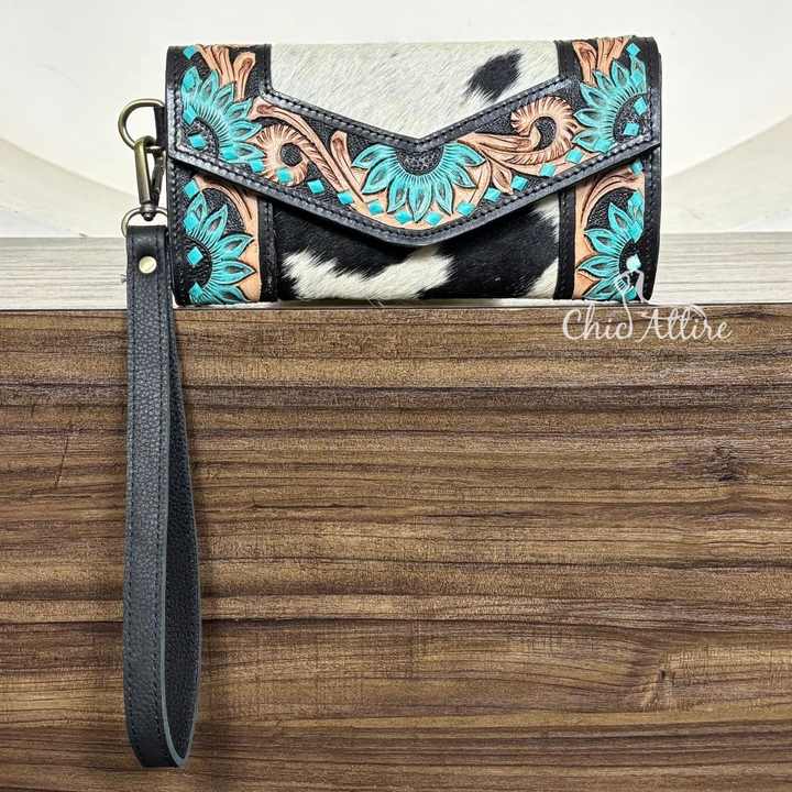 New Wholesale Western Tooled Cowhide Leather Clutch Bag Women Evening Handbag Fashion Mini Wristlet Purse Trendy Designer Pouch