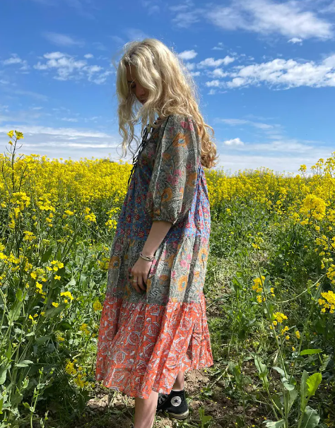 New Women 3/4 Sleeves Calf Length Floral Printed Multi Color Tier Women Loose Fitted Printed Dress