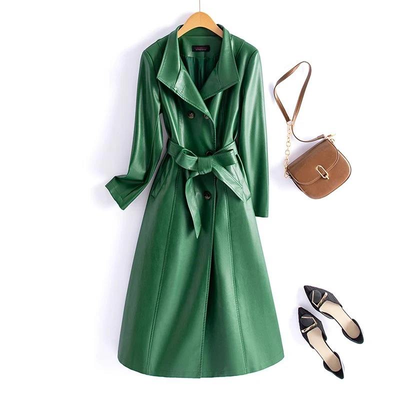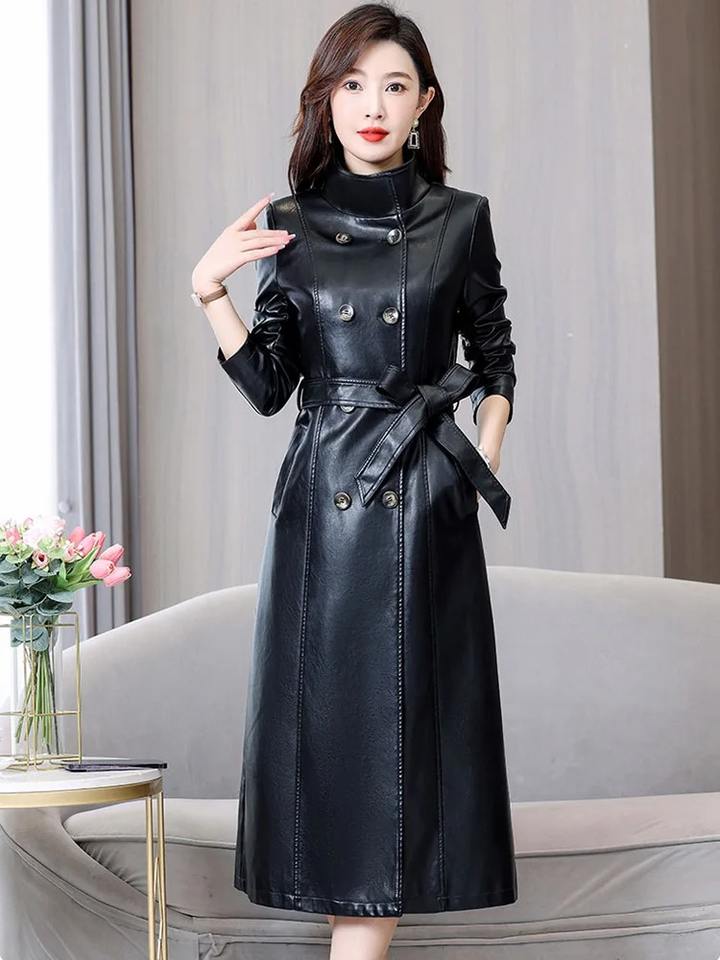 Women's Autumn Winter Fashion Waterproof Leather Trench Coat New Double Breasted Long Slim Design with Lace-Up and Stand Collar