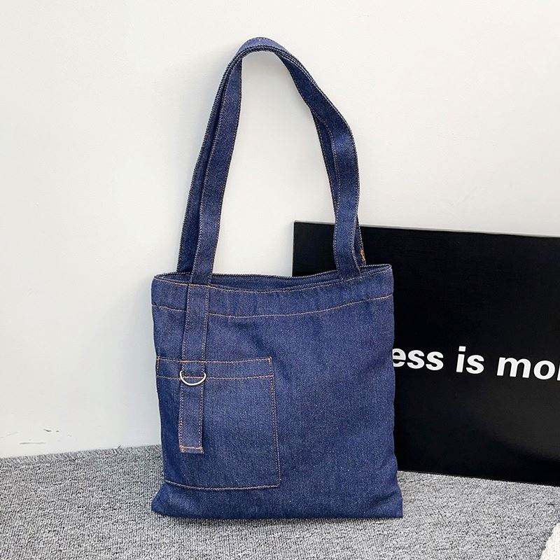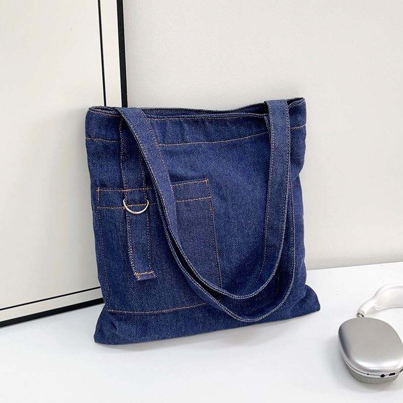 New Women's Casual Simple Girl Tote Bag Handmade Cross Border Denim Shoulder Handbag Two Open Foldable for Students Tutoring