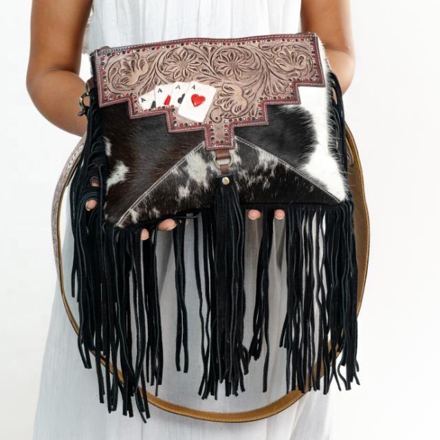 New Women's Genuine Leather Canteen Bag Cowhide Fur Hand Tooled Anti-Theft Shoulder Sling Fringes Purse Vintage Western Bohemian