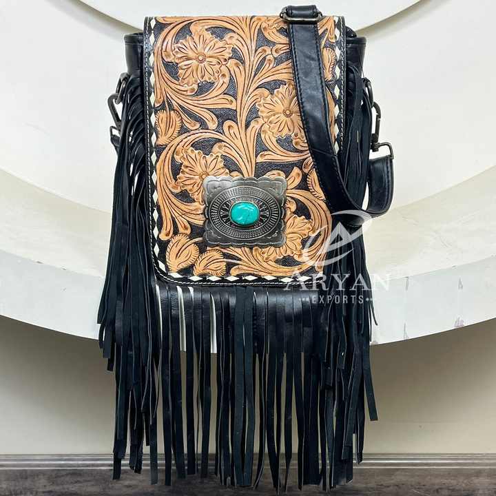 Hand Tooled Genuine Leather Fringe Crossbody Bag