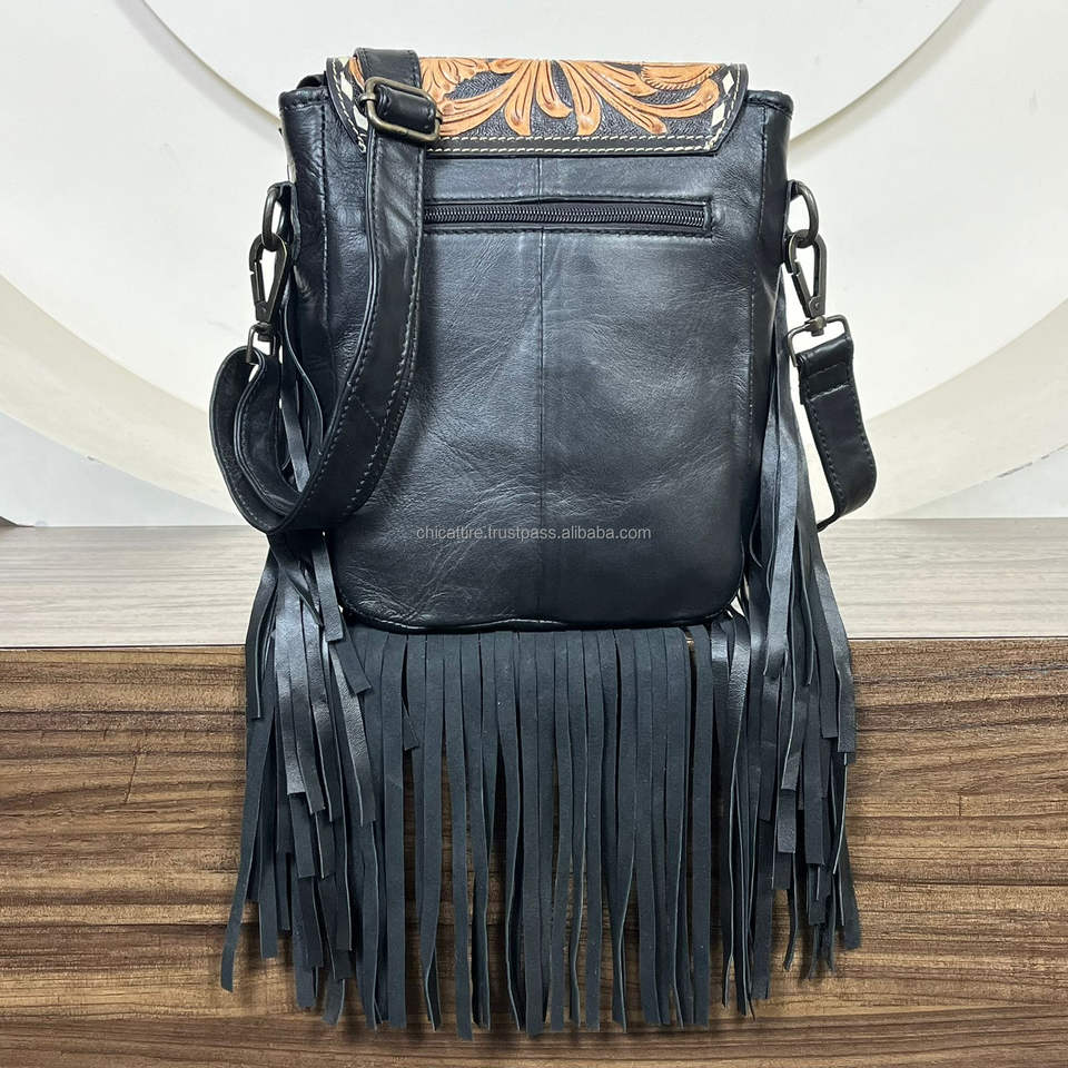 Hand Tooled Genuine Leather Fringe Crossbody Bag