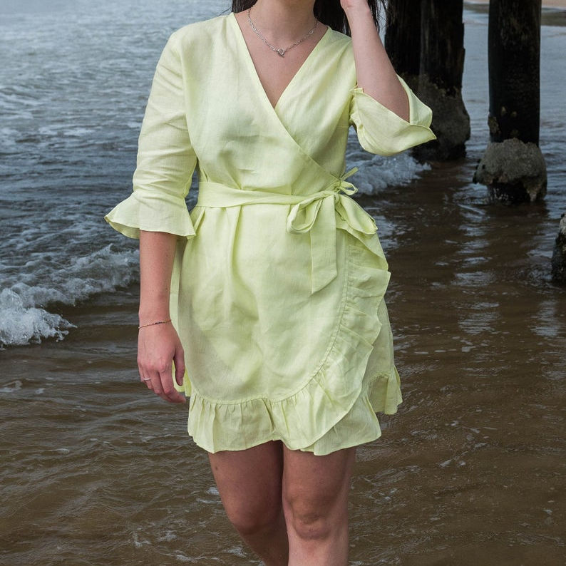 New arrival fashionable trending latest design yellow color crepe fabric v-neck half sleeve knee-length sexy women linen dress