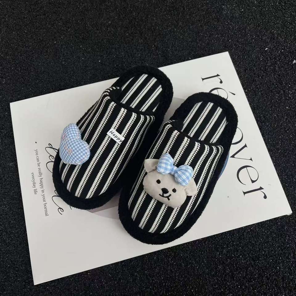 New Winter Slip-Resistant Warm Home Cotton Slippers for Women Plush Upper EVA Outsole Striped Cartoon Heart-Shaped Headbands