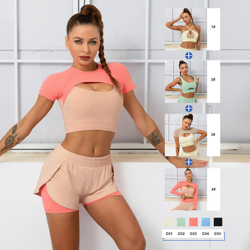 New fashion Yoga set Custom Logo Splicing Athletic Wear for Woman, 4 Style Sports Tops Gym Shorts Leggings Ropa De Mujer Sets