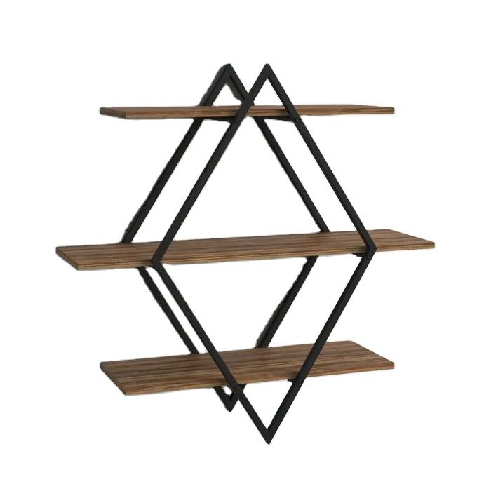 New Look Latest Durable Shelves/shelf High Quality Diamond Shape Wood and Black Metal Frame Wall Mounted Floating Shelves